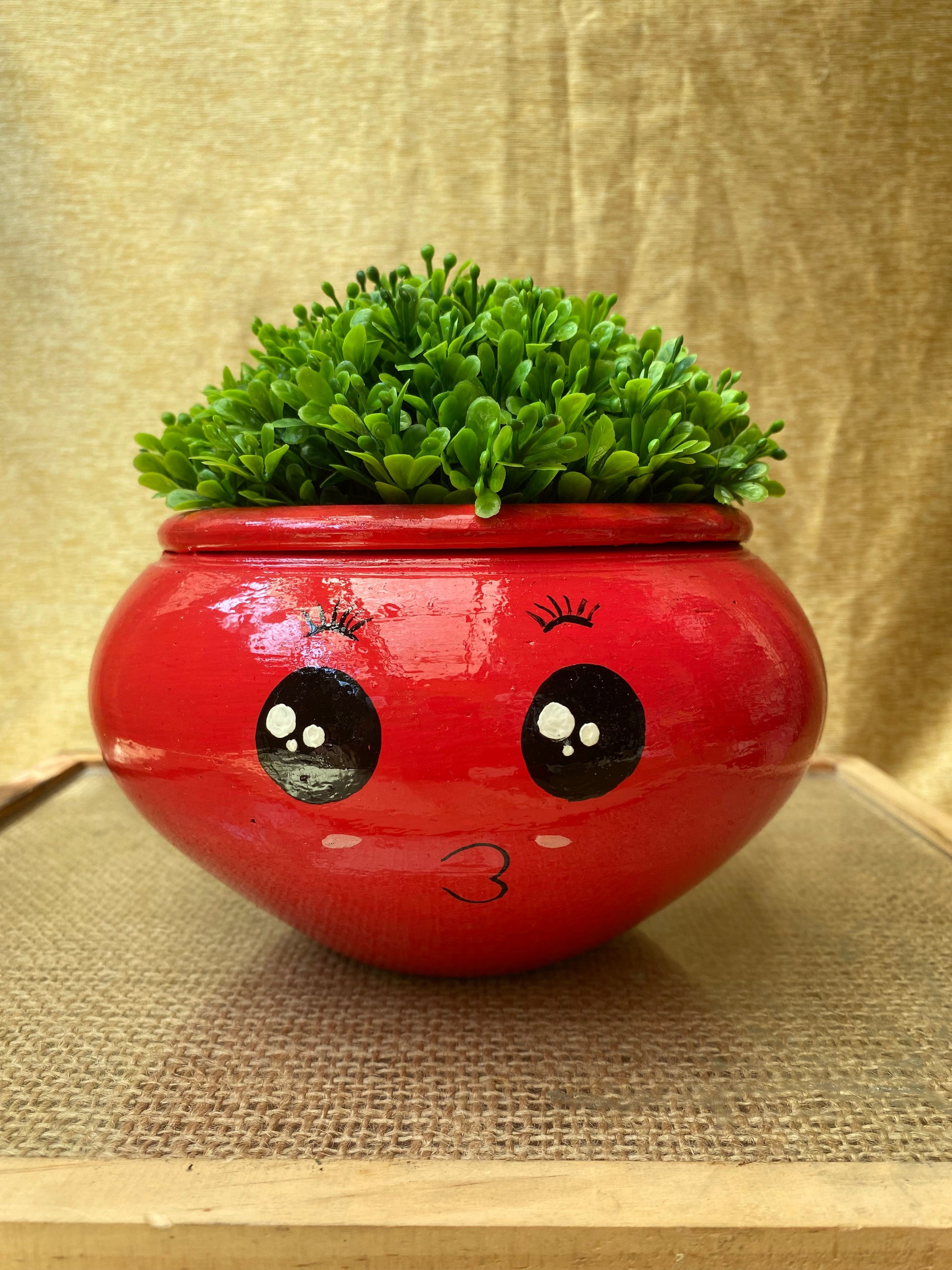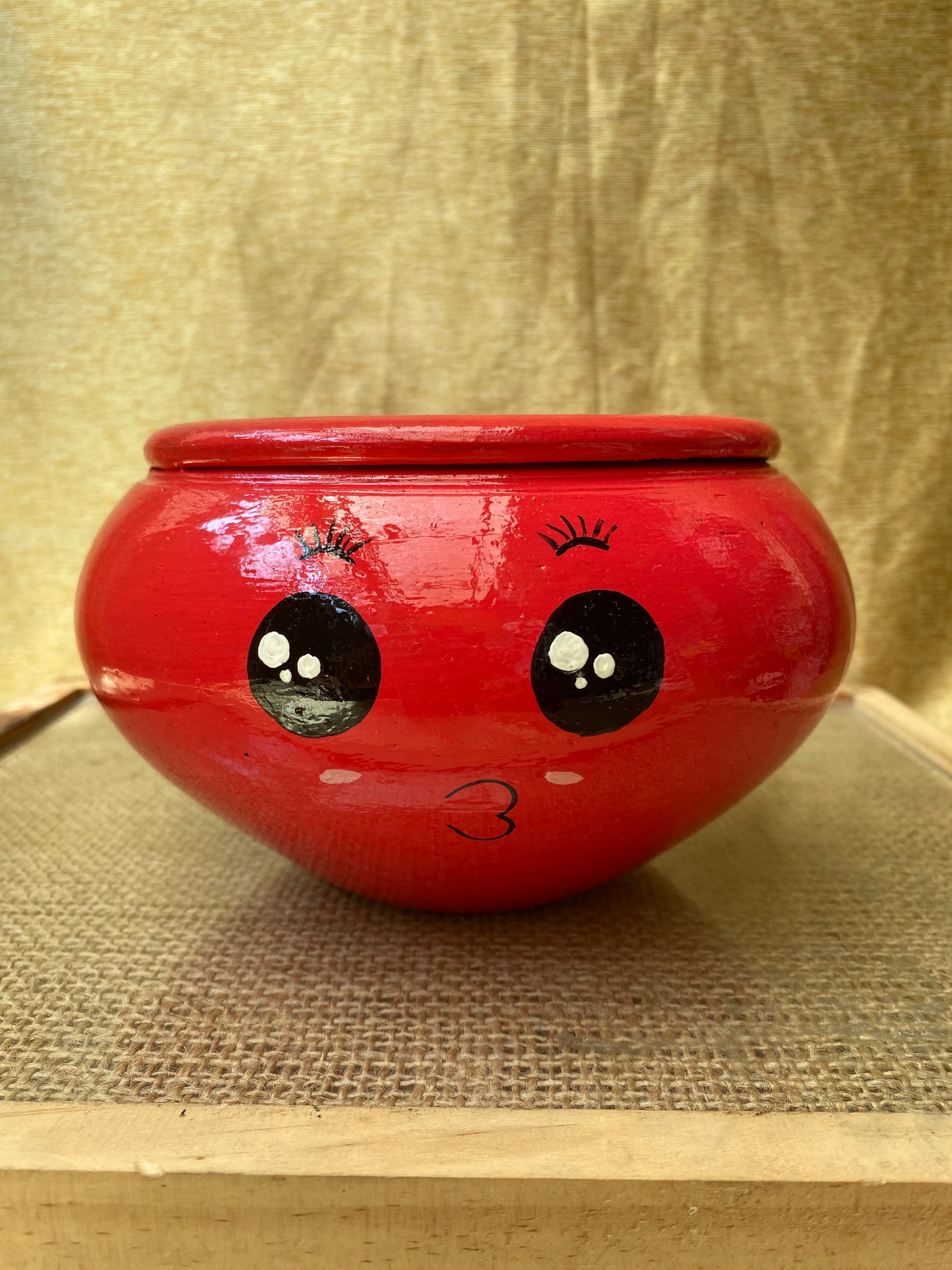 Description: Our hand painted Nakhre Planters are everyone's favourite. Add a bit of expressions to your blank canvas with this Red Pout Planter. This medium sized planter is ideal to use indoor as it does not have a hole at the bottom but at the same time it makes it easy to place in any corner and on any surface without worrying about spilling or leakage! But no hole won't damage the plant? No, terracotta has ability to absorb water, you can feel the planter turn cold when you add water in it, hence the plant can be all happy and green even with no hole at the bottom.